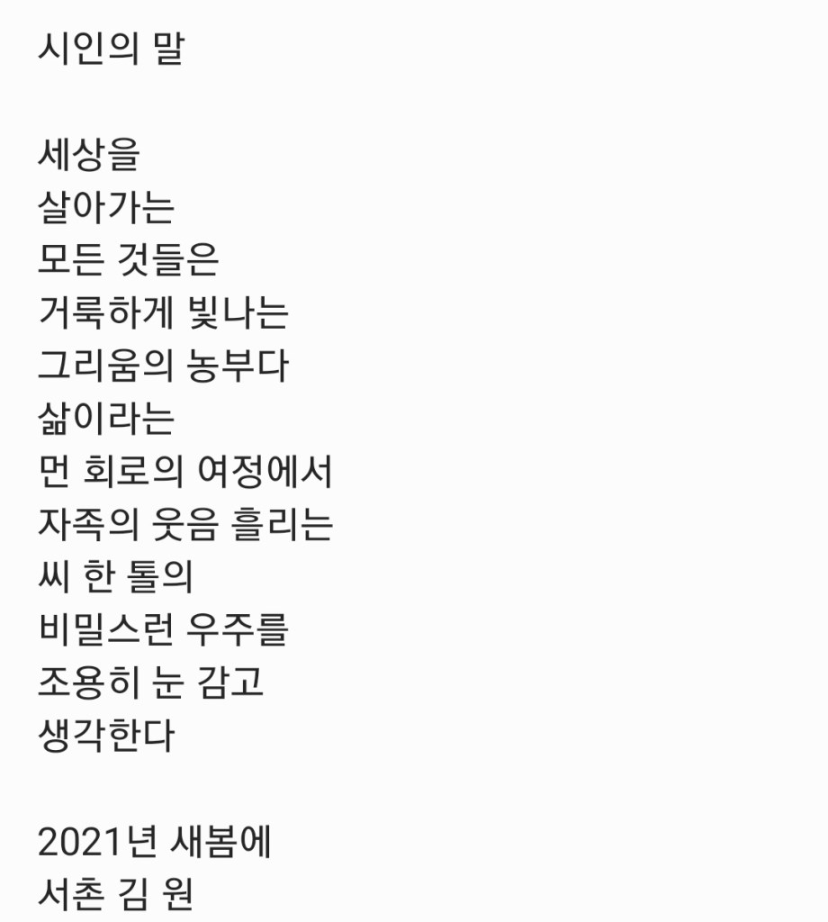 그동안 매주 연재시를 정리해서 송고해 주시느라 수고 많으셨던 김원 시인님께 깊은 감사의 인사를 올립니다.
