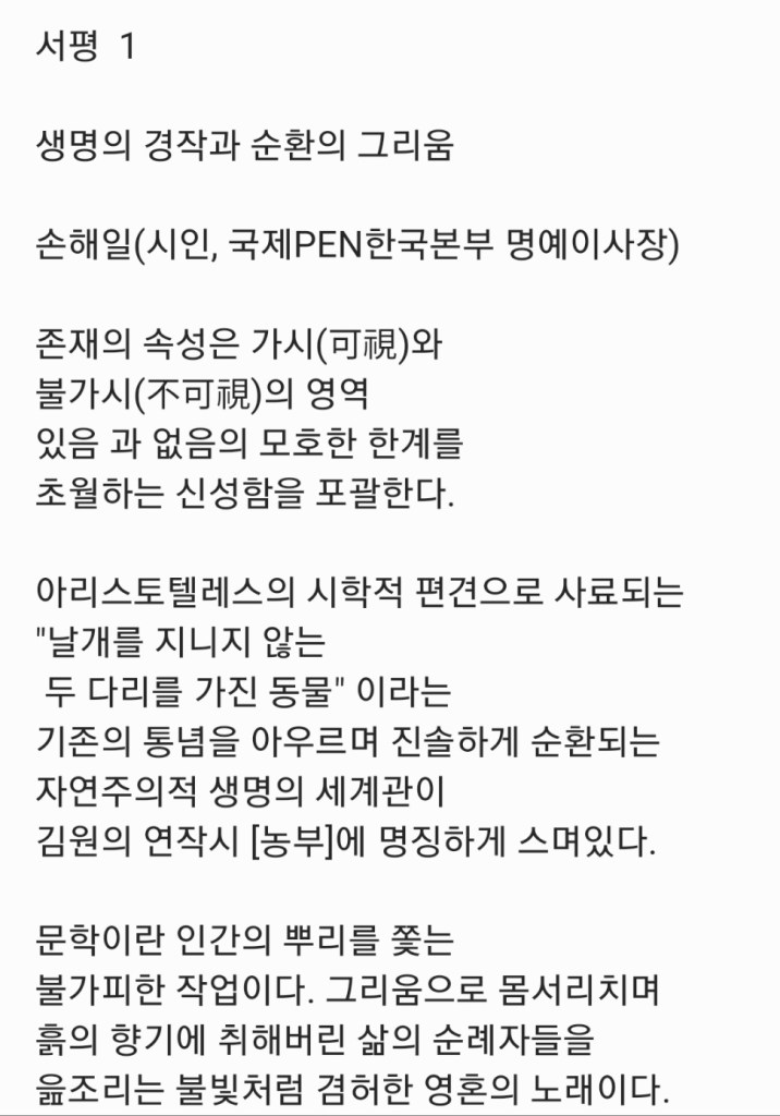또한 이어지는 다음 작품선정에 있어서 김원 시인님과의 논의 끝에 2022년 제2회 한용운 문학상 계관부분 수상 시집 농부 작품으로 선정을 하여 앞으로도 계속 애독자 여러분들과 함께 하게 되었아오니 많은 관심과 성원을 부탁드립니다.