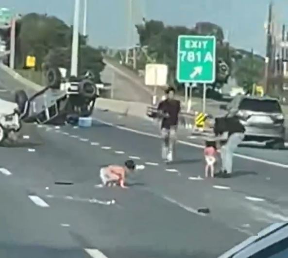 온라인에 공유된 사고 직후 동영상에는 기저귀를 찬 아이 두 명이 고속도로 한복판에서 배회하는 모습이 담겼다.