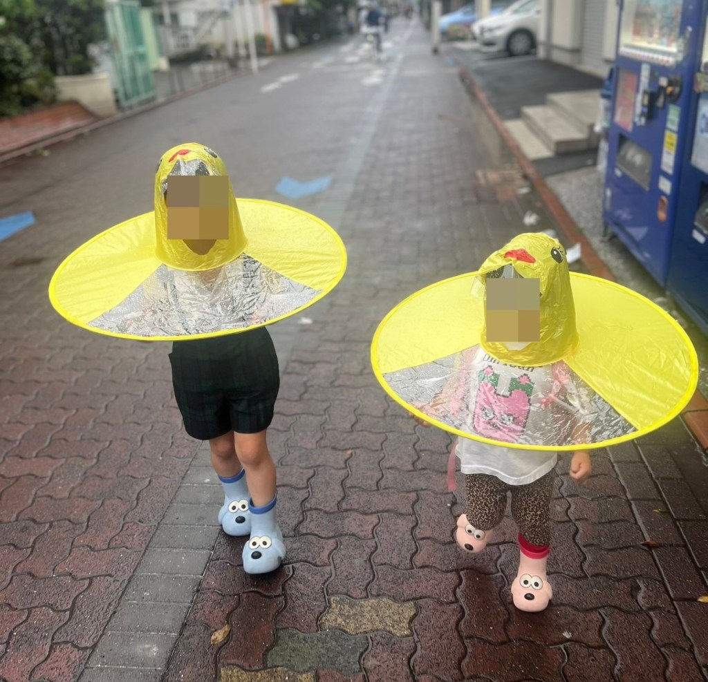 아이들은 코트처럼 입는 우비가 아니라 머리에 쓰면 어깨에 우산이 펼쳐지는 특별한 형태의 우비를 착용하고 있었다.