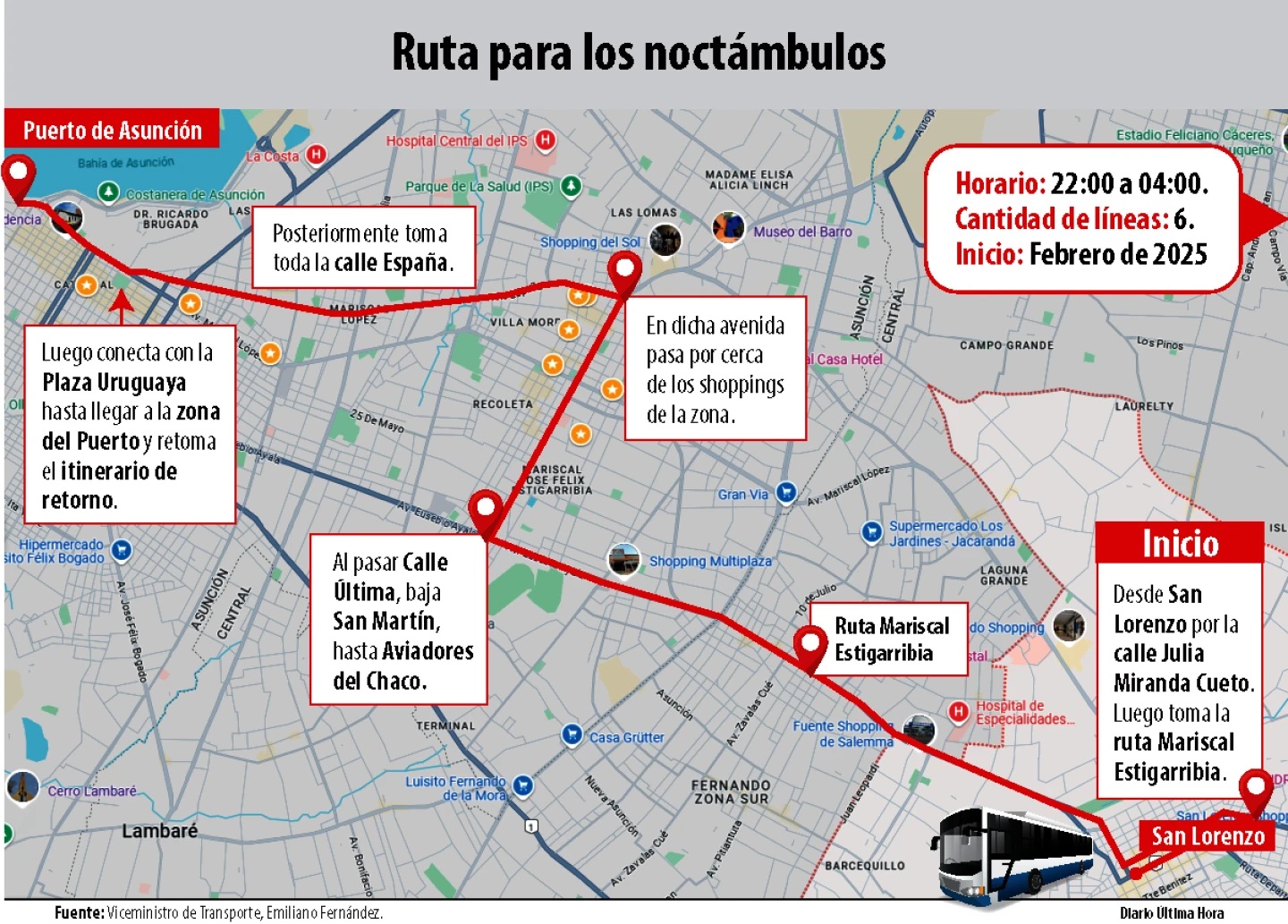 에밀리아노 페르난데스 교통부 차관은 지난 1월 28일 현지 언론과의 인터뷰에서 “부호 서비스는 오후 10시부터 다음 날 새벽 4시까지 운행될 예정이며, 초기에는 5대의 버스가 투입된다”고 밝혔다. 버스 운행 간격은 30분에서 45분이며, 주말에는 운행 횟수를 늘릴 계획이다.