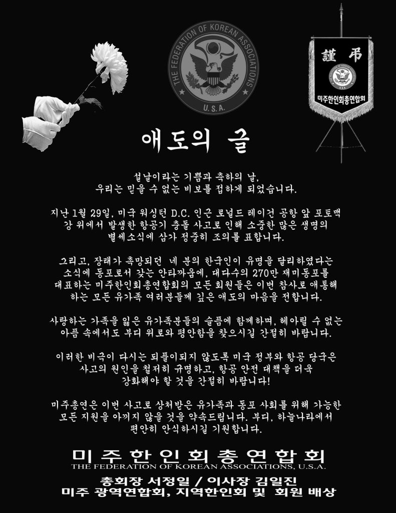 美 여객기 사고, 한인 변호사도 숨져…’애도사’ 발표한 미주총연, “유족 만나 위로할 것”