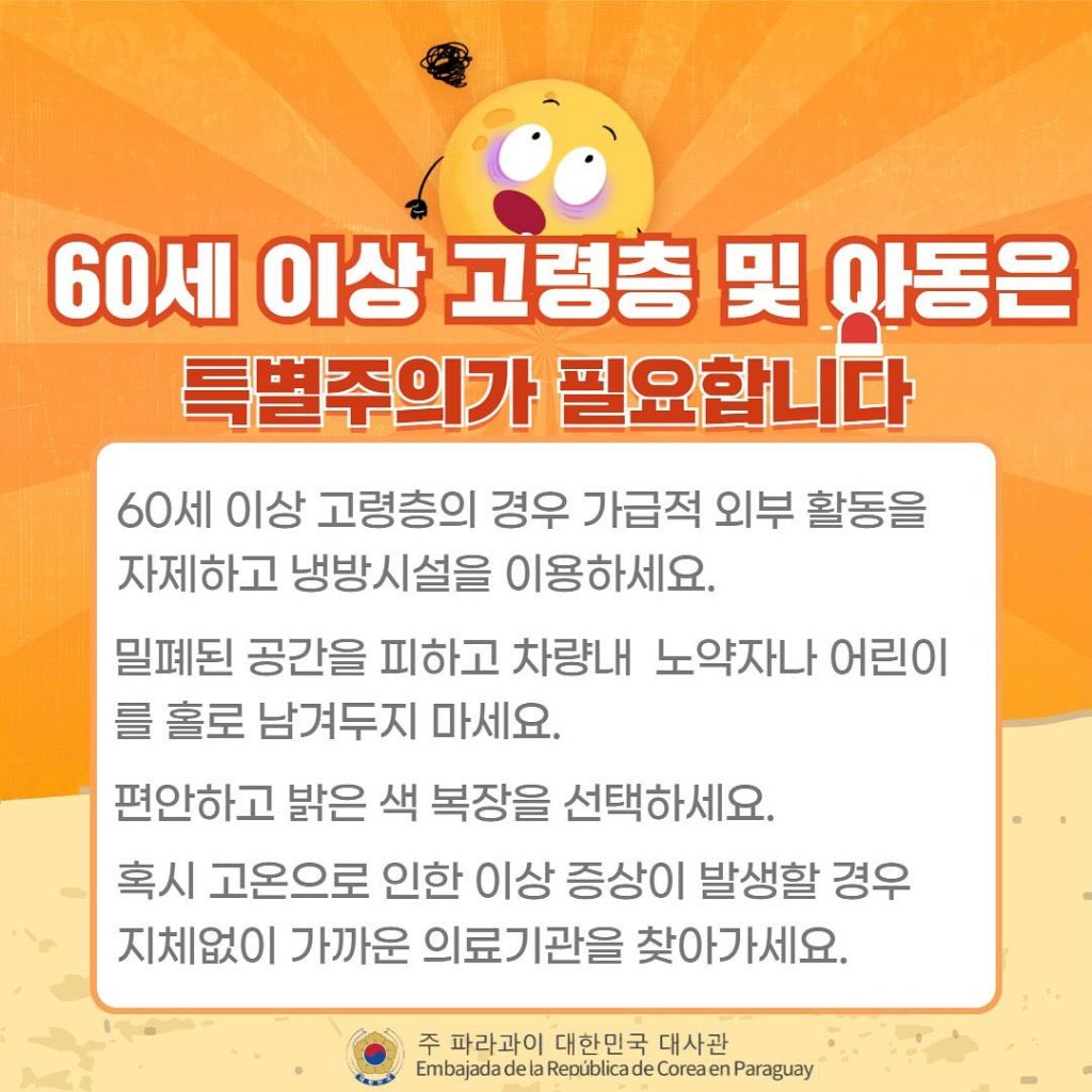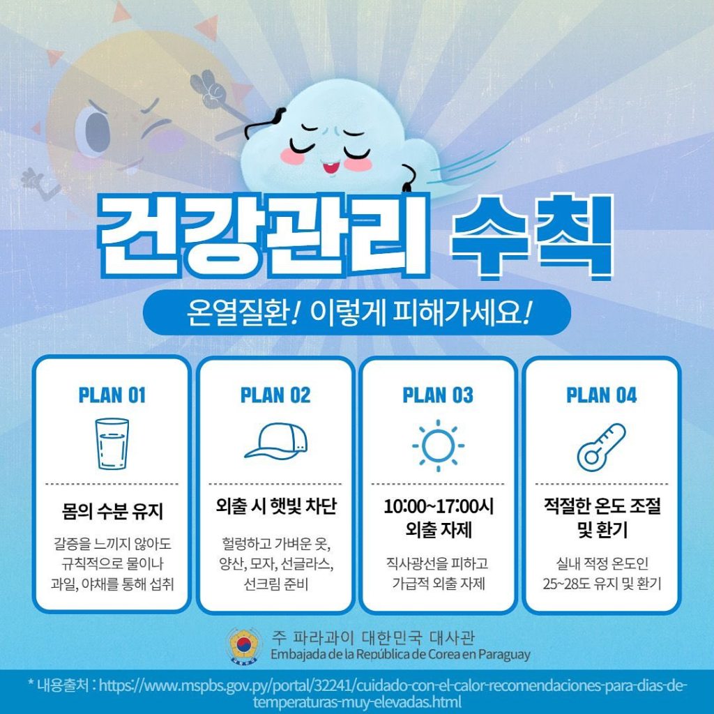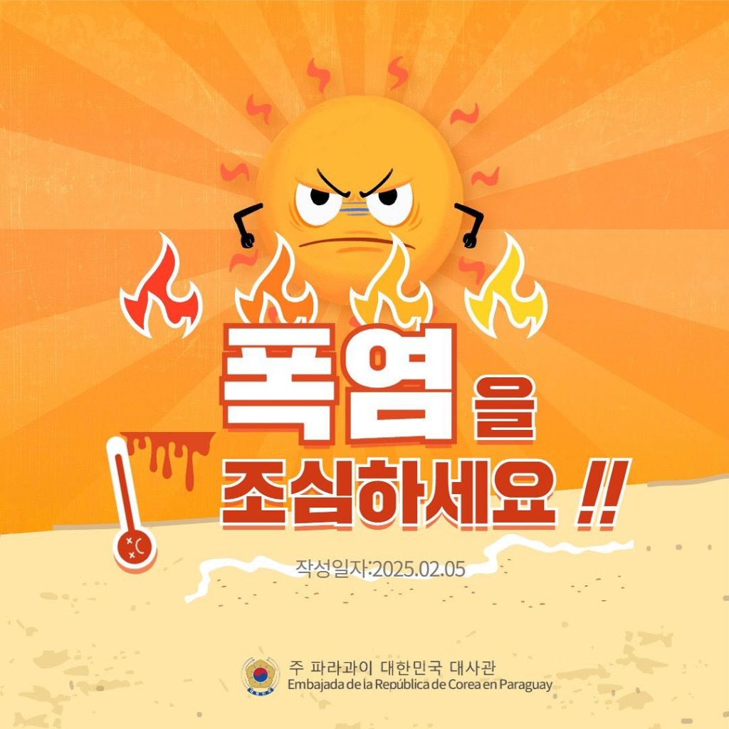최근 40도를 웃도는 폭염이 이어지고 있는 가운데 파라과이 보건복지부에서는 폭염대비 및 온열질환을 예방하기 위한 행동요령을 발표했습니다.