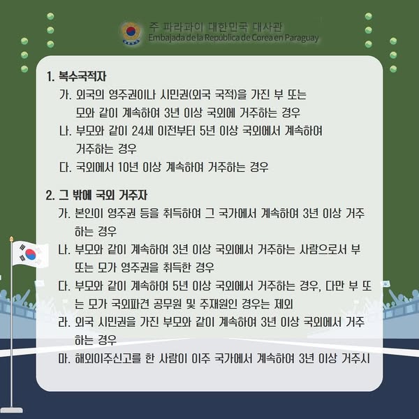 국외에 거주하는 병역의무자가 복수국적자 또는 국외거주자 요건을 갖추고 있으면 37세까지 병역을 연기받을 수 있으며, 그렇게 하기 위해서는 24세부터 25세가 되는 해 1월 15일 사이에 재외공관을 통해 ‘국외이주’ 사유로 국외여행허가를 받아야 합니다.