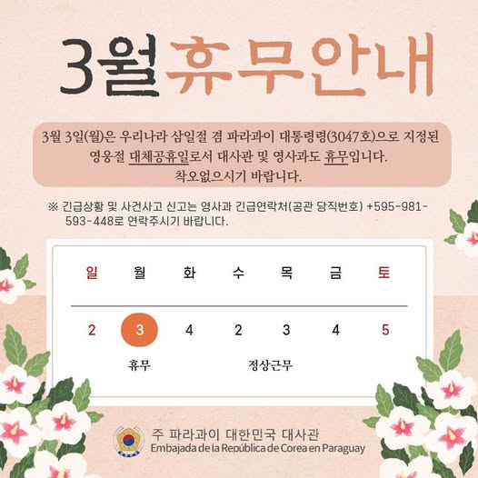 3.3일(월)은 우리나라 삼일절 겸 파라과이 대통령령(3047호)으로 지정된 영웅절 대체공휴일로서 대사관 및 영사과도 휴무이오니 착오없으시기 바랍니다.