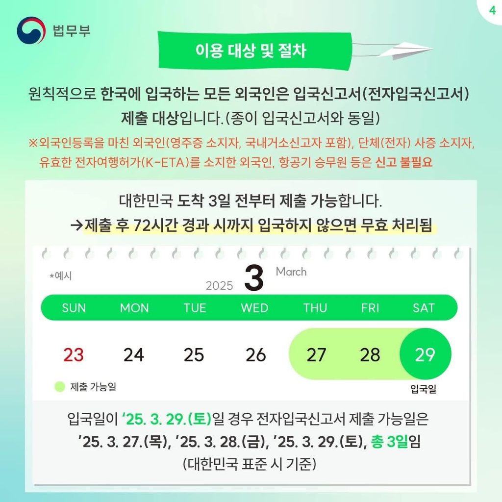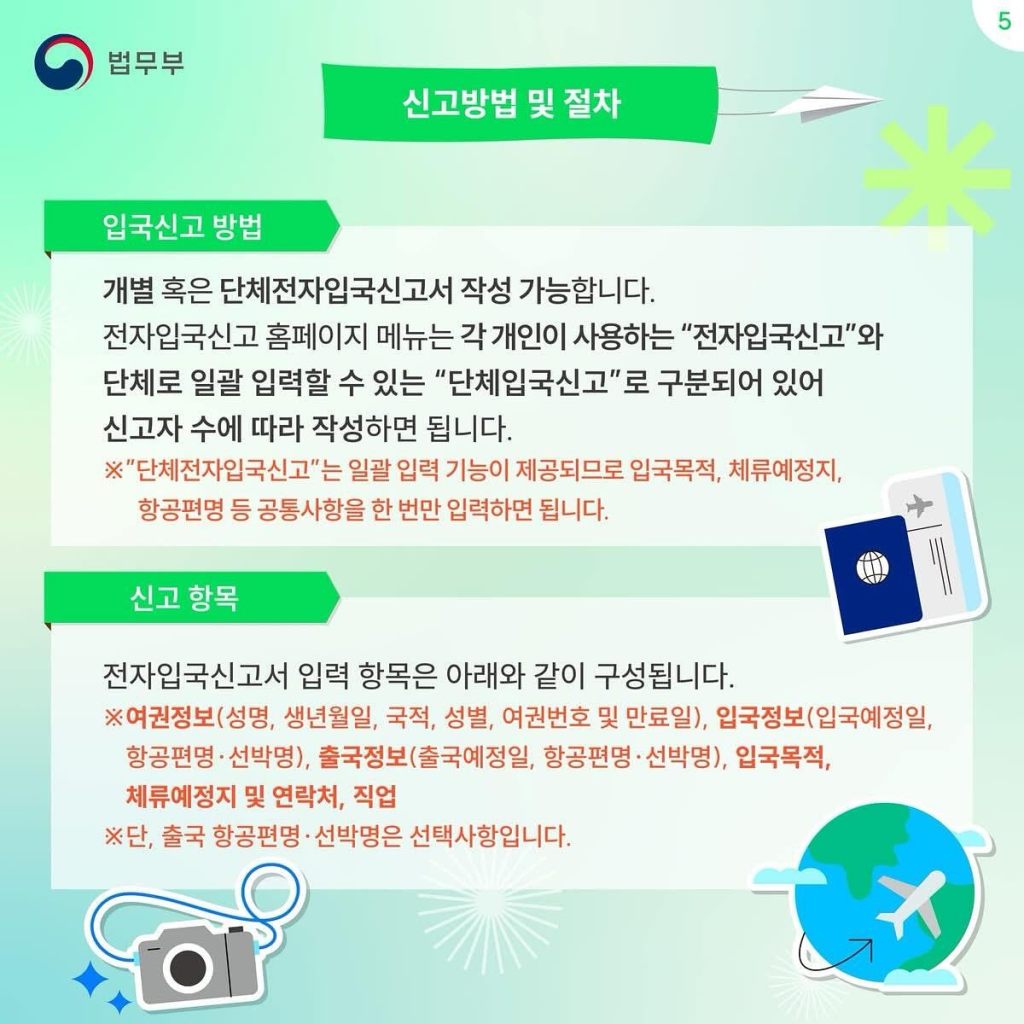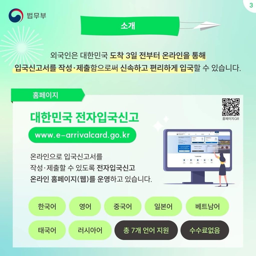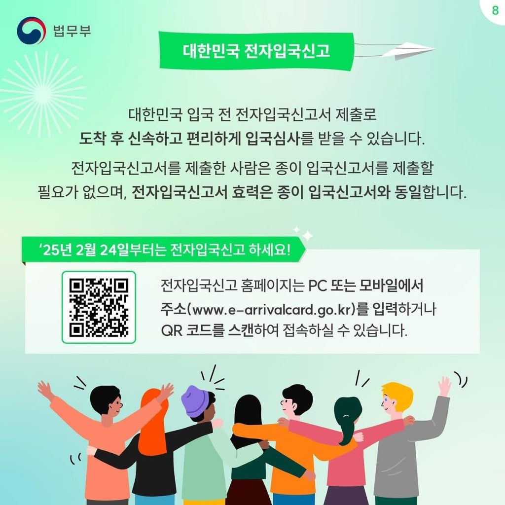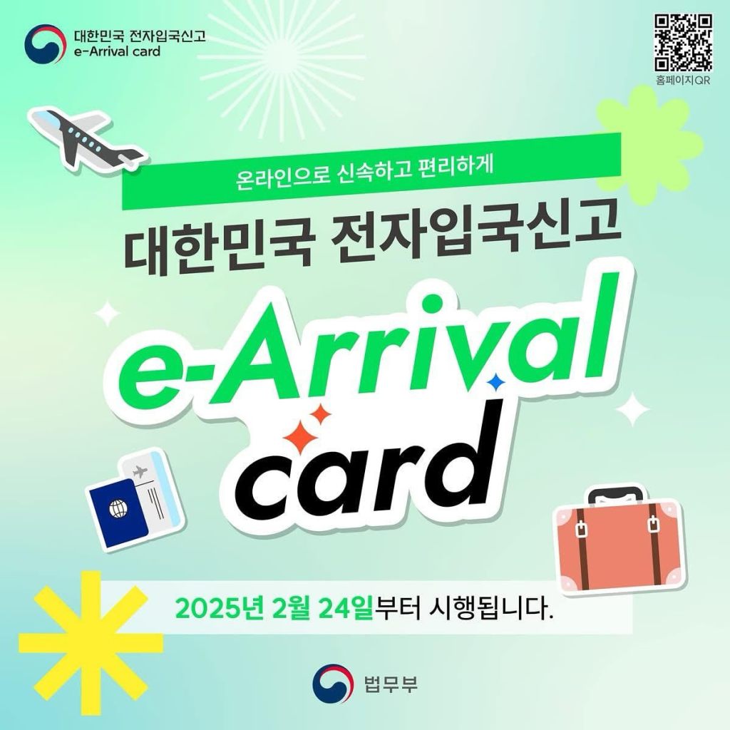 온라인으로 신속하고 편리한 “대한민국 전자입국신고 e-Arrival Card”가 2025.2.24일부터 시작되었습니다.