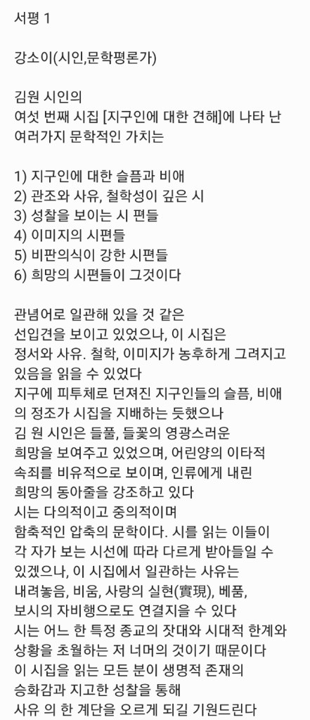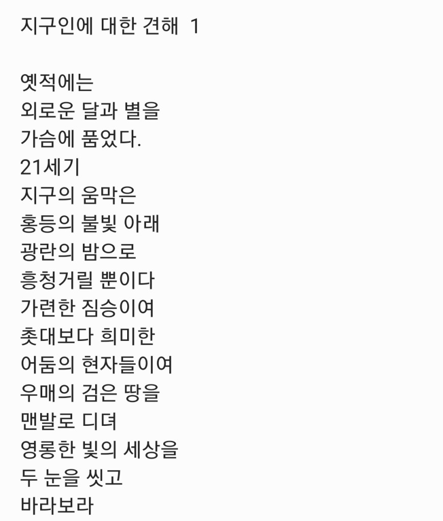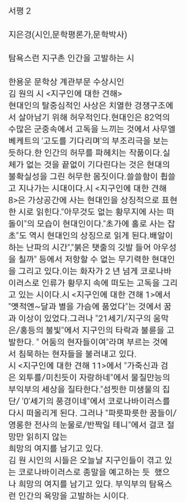 오늘부터 연재하여 드릴 연재 시 *지구인의 대한 견해* 작품에 대한 서촌 김원 시인의 말씀입니다.