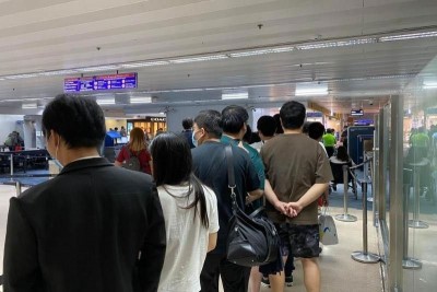▪POGO 근로자들이 니노이 아키노 국제공항의 출입국 심사 카운터에 줄을 서 있는 모습.