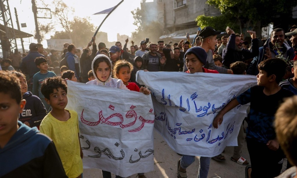 25일(현지시간) 팔레스타인 가자지구 북부 베이트라히아 주민들이 하마스 통치에 반대하는 시위를 벌이며 “죽고 싶지 않다”고 쓰인 플래카드를 들고 있다. 2025.3.26 photo@yna.co.kr