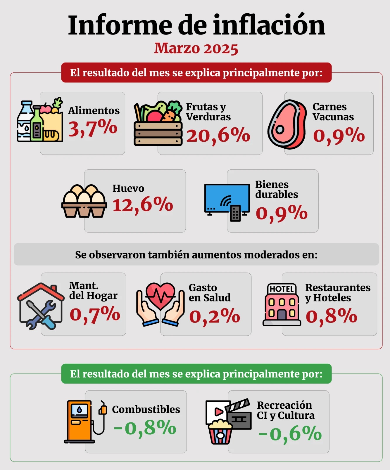 보고서에 따르면, 3월 인플레이션의 주요 요인은 식품 가격 상승(3.7%)이었다. 특히 과일과 채소류는 20.6%나 급등했는데, 이는 기후 충격으로 인한 생산 감소와 계절적 요인이 결합된 결과로 분석된다. 유니스 수석 경제학자는 “기후 변화로 인해 국내 생산이 제한되었고, 농업축산부(Ministerio de Agricultura y Ganadería)와 같은 규제 기관이 특정 품목의 수입을 제한하면서 공급 부족이 심화됐다”고 설명했다. 이에 따라 토마토, 양파 등 주요 농산물 가격이 큰 폭으로 올랐다.