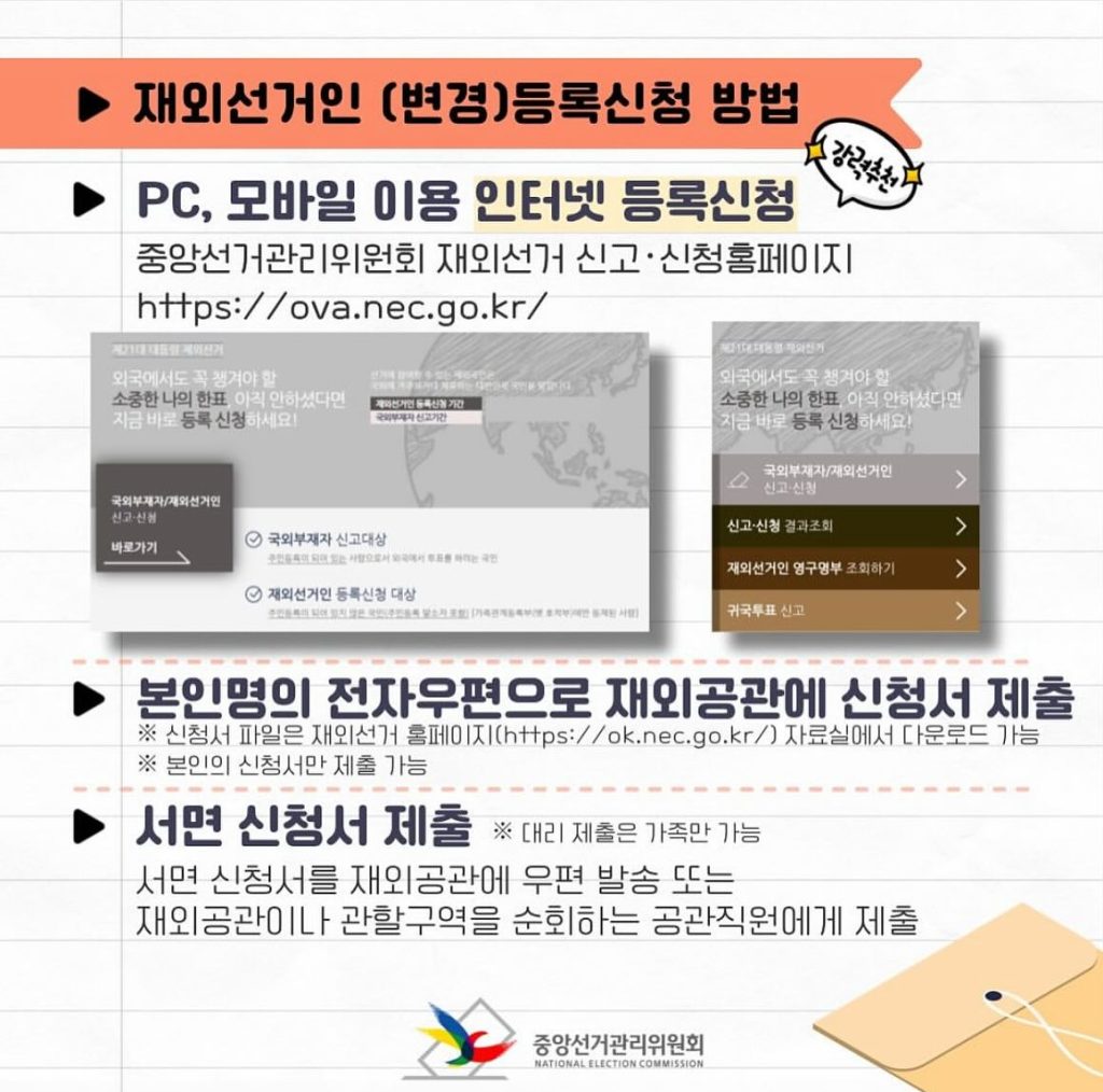 제21대 대통령 재외선거를 위해서는 재외선거인 등록신청을 해야합니다.