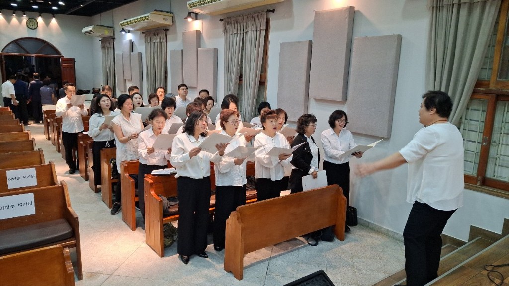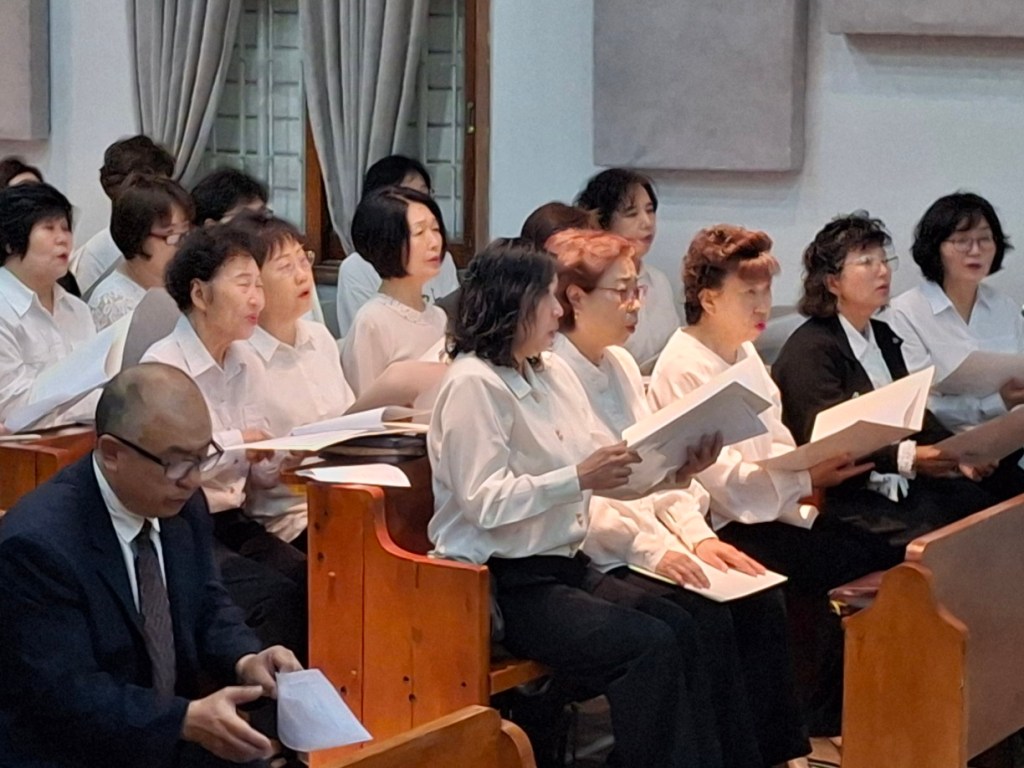 이어서 연합 성가대 지휘자 최희숙 권사 반주 문금자 자매의 “그가”라는 부활절 송을 전면 강단에 나와 서서 힘차고 예수님이 진짜 살아나셨을 때처럼 은은하게 성가 합창을 끝 마치였다.