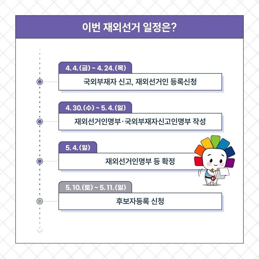 제21대 대통령 재외 선거 주요 일정을 알려드립니다. 참고하시기 바랍니다.