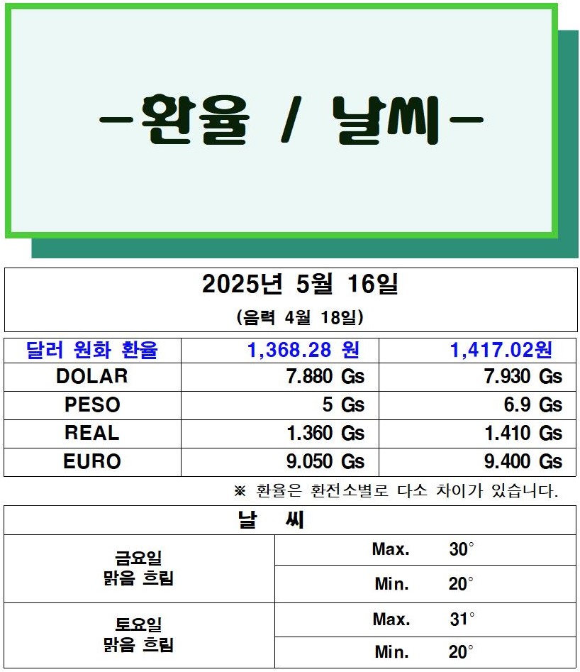 주파라과이대사관은 2025.5.14(수) – 15(목) 이틀간 주재국 독립기념일 (Independencia Nacional)로 인하여 휴무함을 알려드립니다.