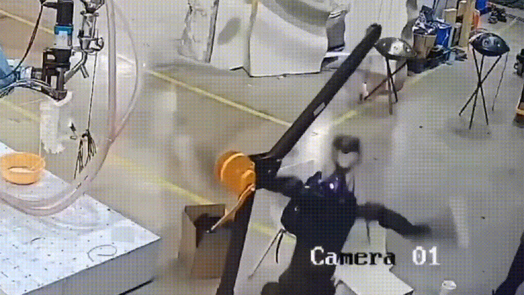 이 모습을 담은 폐쇄회로(CC)TV 영상에는 공장 내에서 2명의 연구원이 미니 크레인에 매달린 로봇을 조작하는 모습이 나온다. 로봇은 작동을 시작하자 사방으로 팔을 미친 듯이 휘두르면서 연구원을 공격하려는 모습을 보였다. 이로 인해 주변에 있던 컴퓨터 모니터 등의 물건이 떨어지기도 했으며 로봇과 함께 크레인도 움직였다.