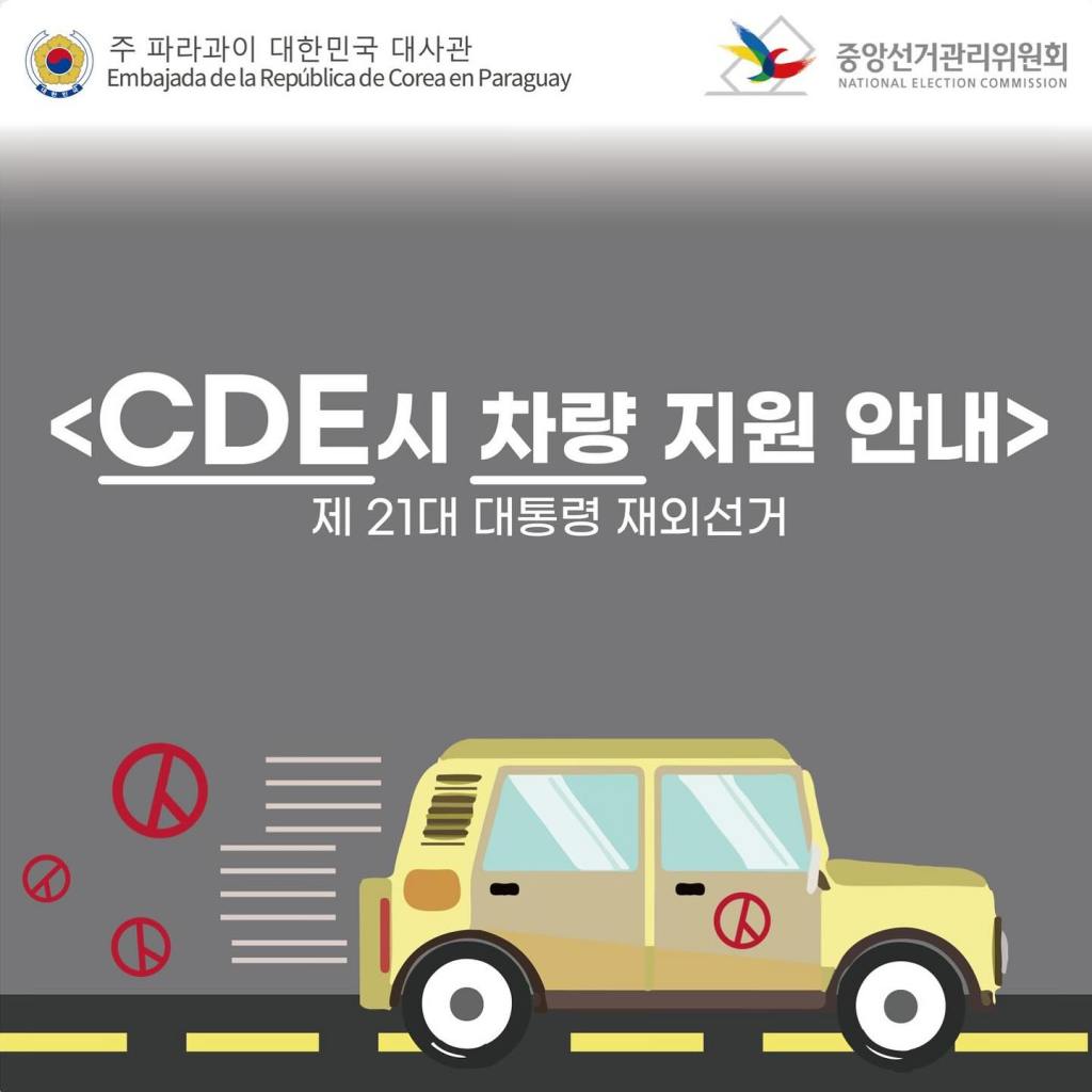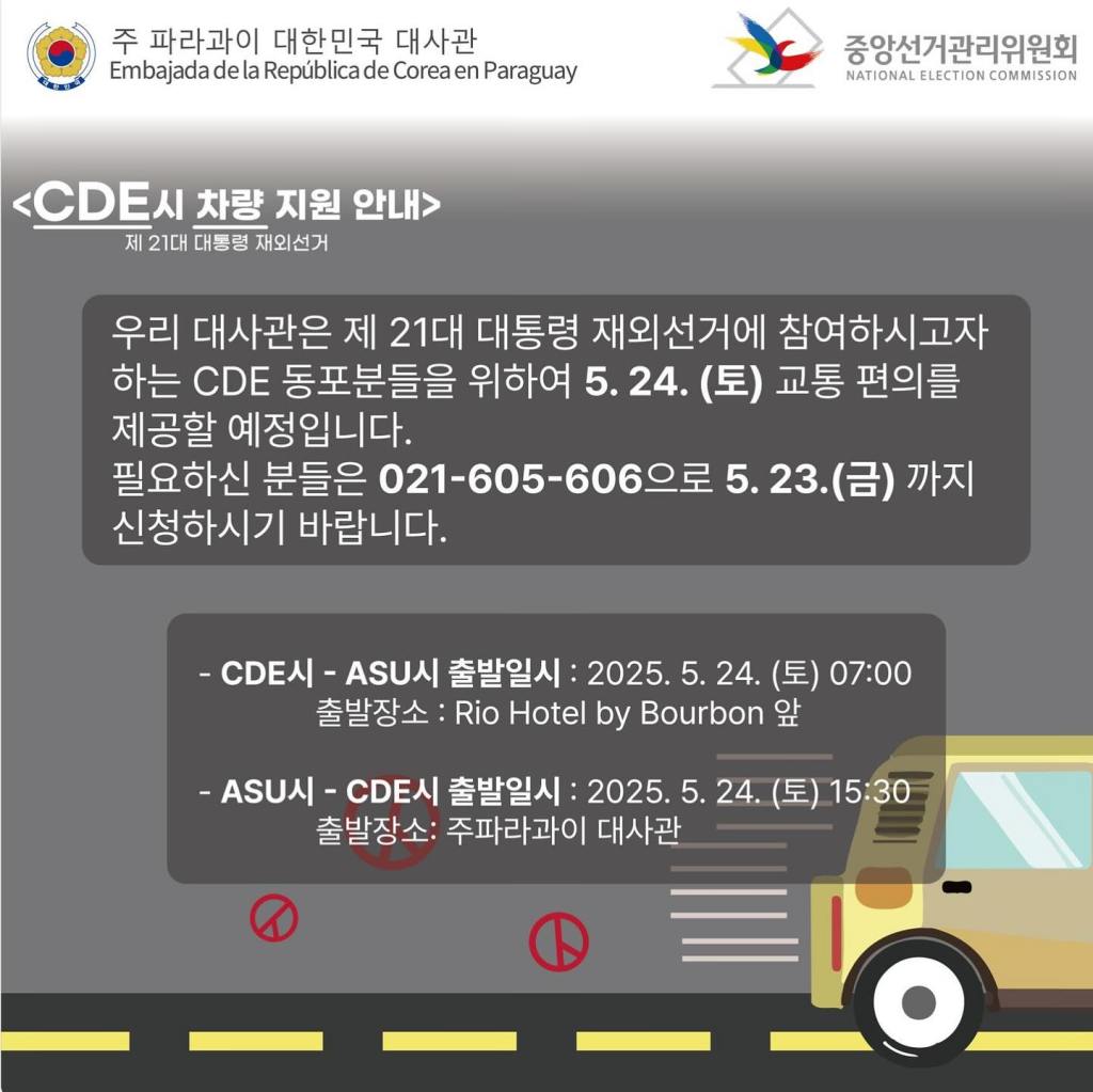 남미동아뉴스 >> <민원실 특별 운영 안내>우리 대사관은 제21대 대통령 재외선거 참가차 공관을 방문하시는 분들을 위해 5.24-25(토-일) 주말에 민원실을 특별 운영할 예정이오니 참고해주시면 감사하겠습니다. 우리 대사관은 제21대 대통령 재외선거에 참여하시고자 하는 CDE 동포분들을 위하여 5.24(토) 교통편의를 제공할 예정입니다. 필요하신 분들은 021-605-606으로 5.23(금)까지 신청하시기 바랍니다. 이 글 공유하기: 클릭하여 X에서 공유 (새 창에서 열림) X 페이스북에 공유하려면 클릭하세요. (새 창에서 열림) Facebook 좋아하기 가져오는 중... 글쓴이: 남미동아뉴스 파라과이 다이제스트 남미동아뉴스 남미동아뉴스의 모든 글 보기
