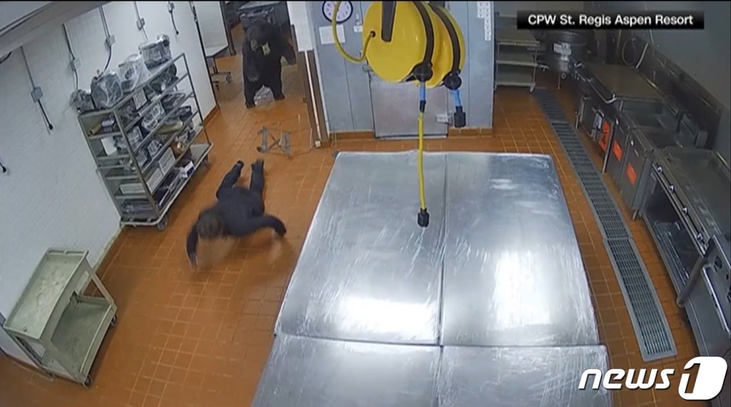 사건 당시 주방에 있던 보안 카메라에는 경비원이 곰을 맞닥뜨리는 장면이 포착됐다. 남성이 무전기를 들고 조심스러운 걸음으로 호텔 주방을 살피던 도중 모퉁이를 돌자 곰이 등장했다.