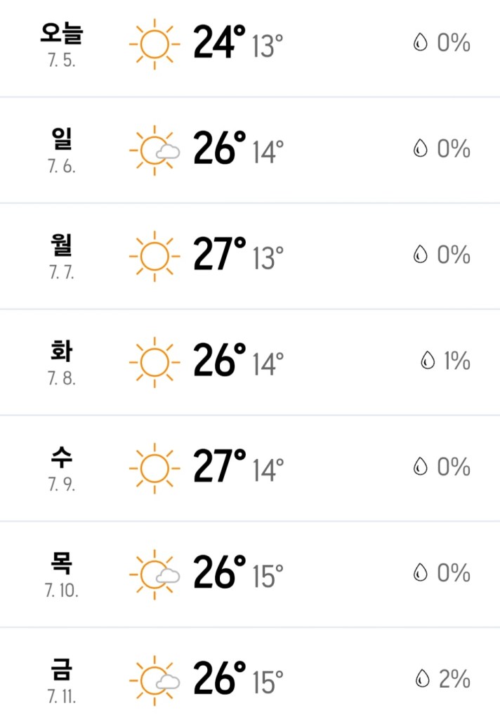 예보에 따르면3일(목)과 4일(금)에는 낮 기온이 각각 27도와 26도로 약간 낮아질 것으로 보인다.