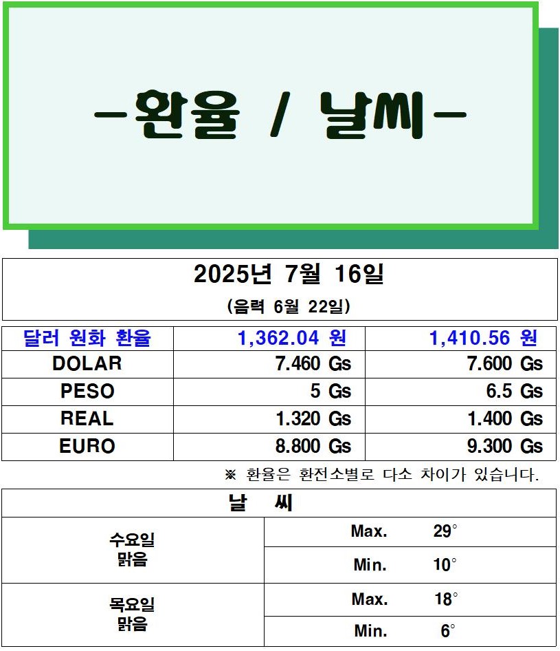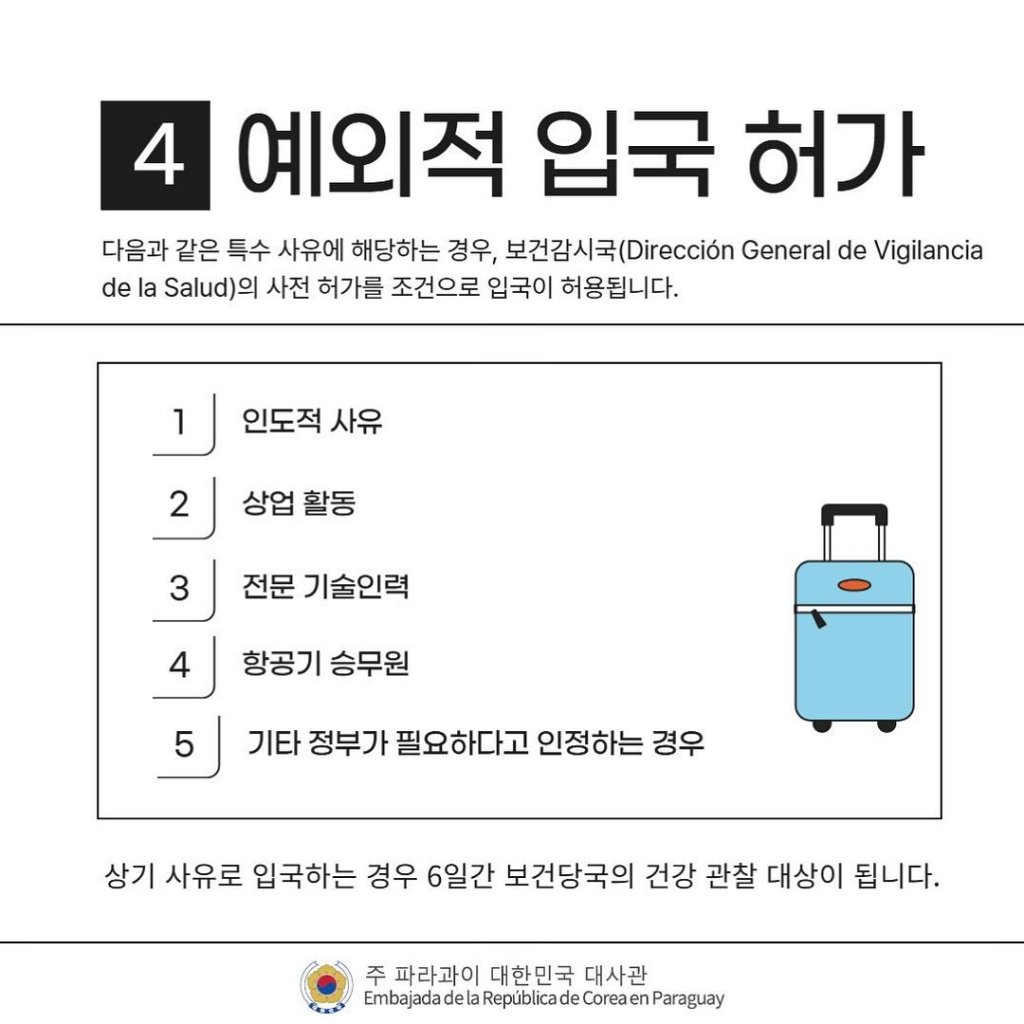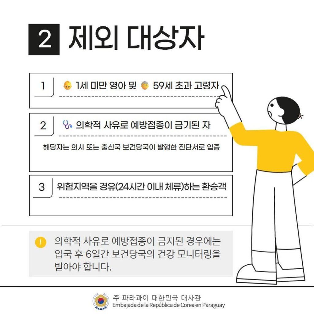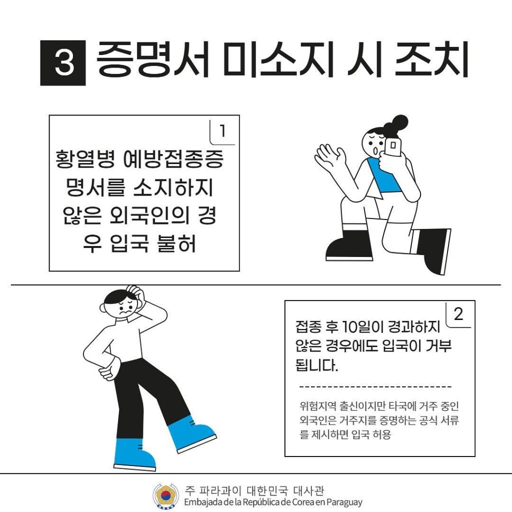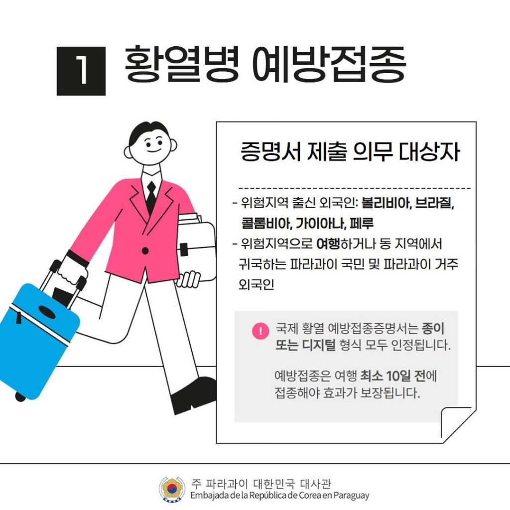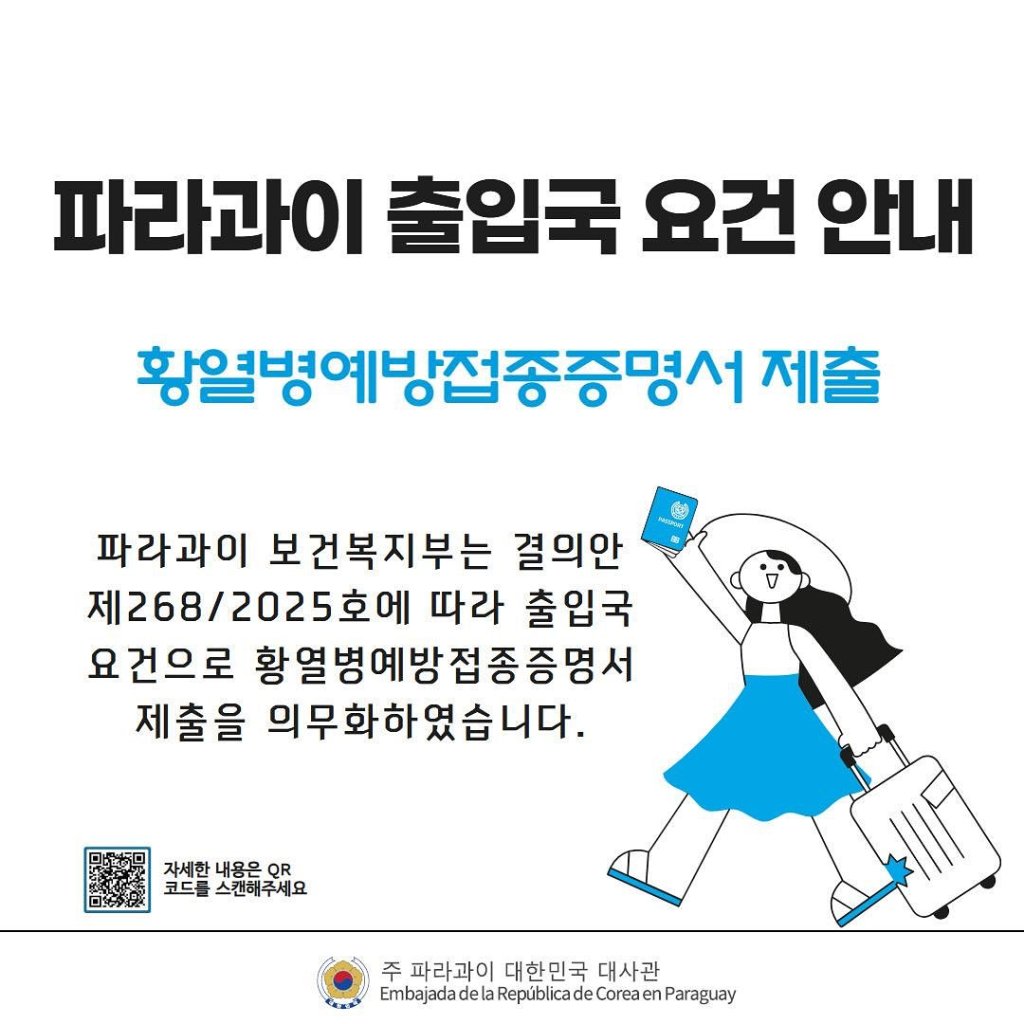 파라과이 보건복지부는 결의안 제268/2025호에 따라 입국 및 출국 요건으로 국제황열병예방접종증명서 제출을 의무화하고 있는 바, 파라과이를 방문하고자 하시는 분은 아래 링크로 접속하셔서 내용을 참고하시기 바랍니다.