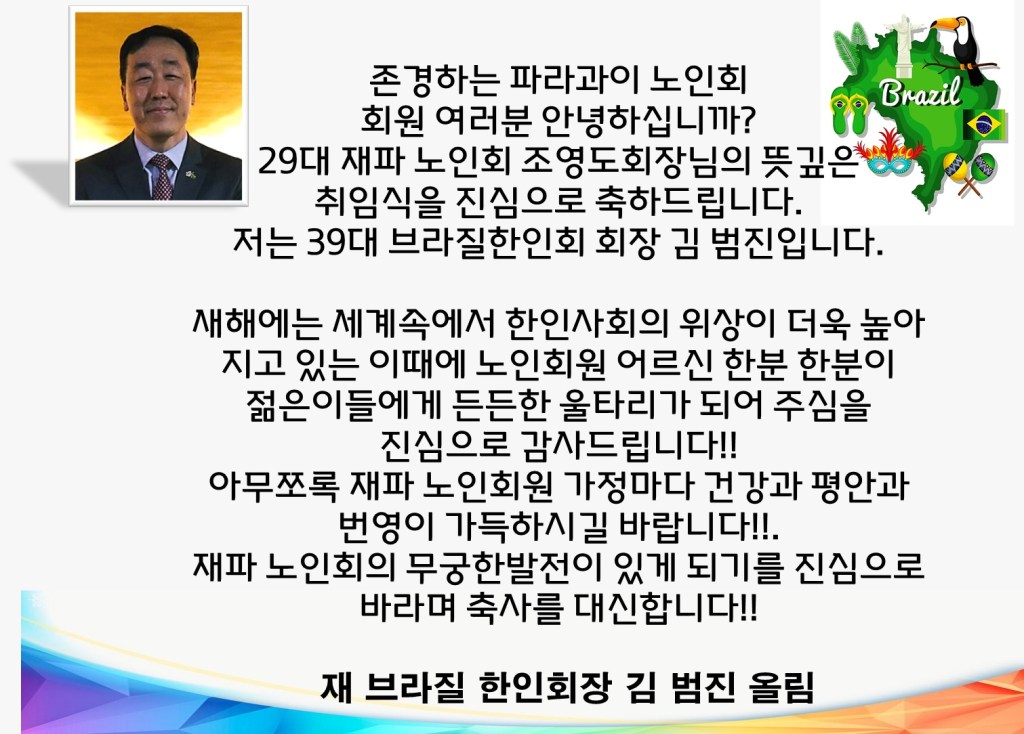 지난 1월 18일(일) 오후, 아순시온 소재 ‘레스토랑 또바기’에서 제29대 재파 한인노인회 회장 취임식이 성대하게 개최되었다.