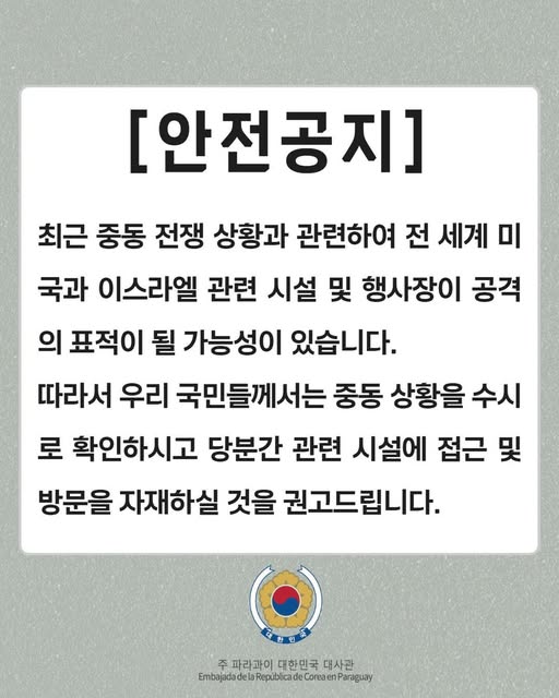 따라서 우리 국민들께서는 중동 상황을 수시로 확인하시고 당분간 관련 시설에 접근 및 방문을 자재하실 것을 권고드립니다.