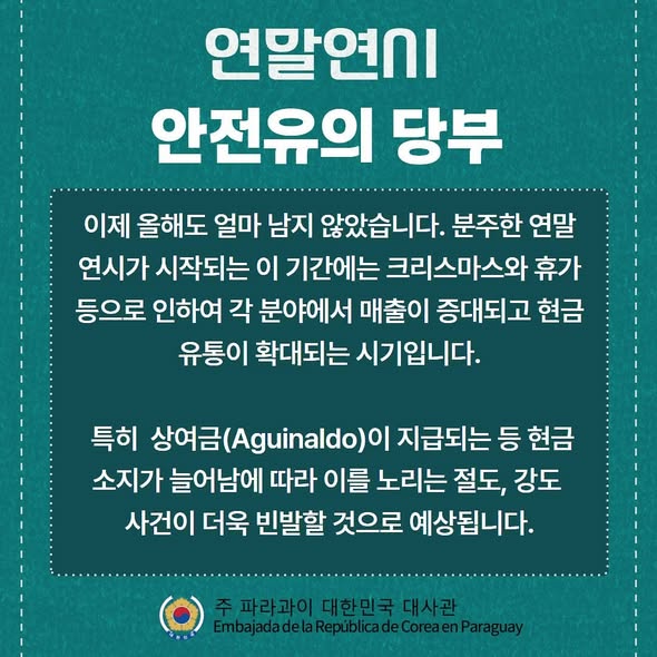 파라과이 전국이 $40^{\circ}C$에 육박하는 폭염을 겪은 후, 최대 시속 $100km$의 돌풍을 동반한 강한 뇌우가 예보되어 기상 이변에 대한 대비가 요구된다. 한편, 카피아타의 카프사 공장에서 수소 저장 시스템과 관련된 것으로 추정되는 폭발 사고가 발생하여 3명의 부상자가 발생했으며, 산업 안전에 대한 경각심을 높였다.