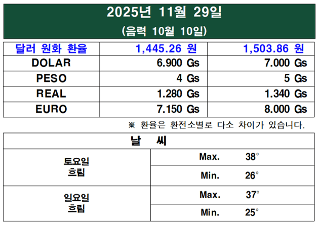11월의 마지막 날인 30일(일요일), 파라과이 전국이 매우 뜨거운 날씨를 기록하며 폭염이 이어졌다. 북동쪽에서 불어오는 바람은 하루 종일 변덕스러운 모습을 보였으며, 일부 지역에서는 최고 기온이 40°C에 육박하는 등 무더위가 기승을 부렸다.