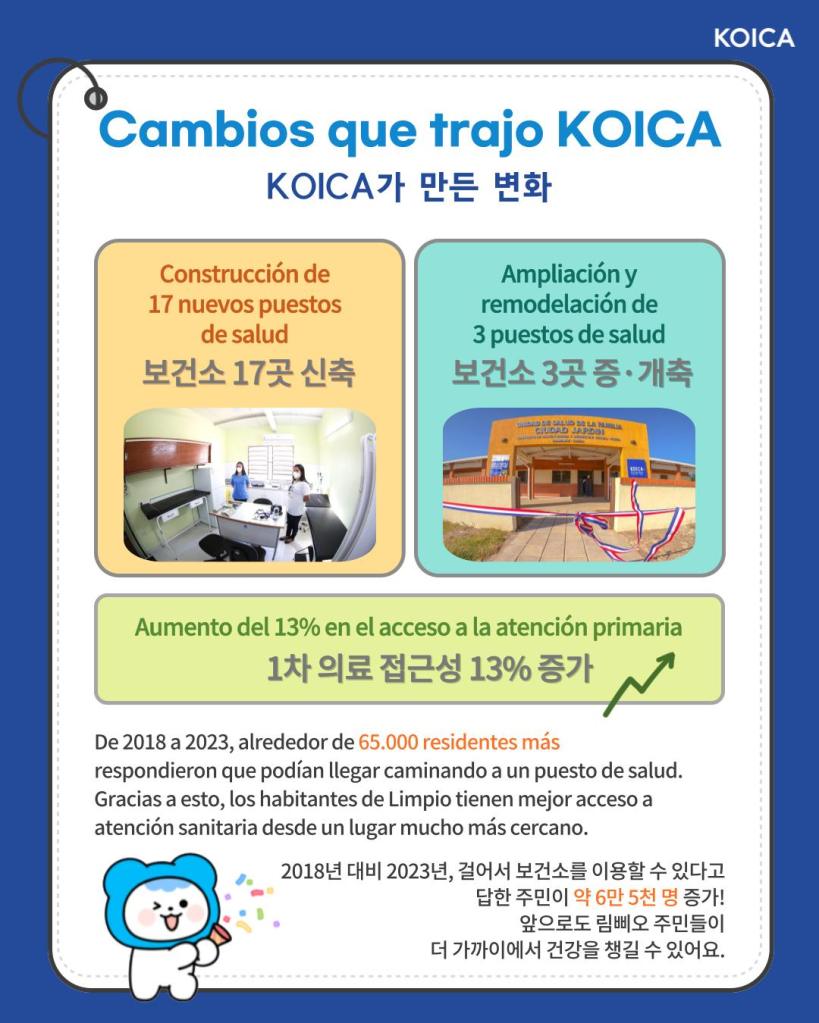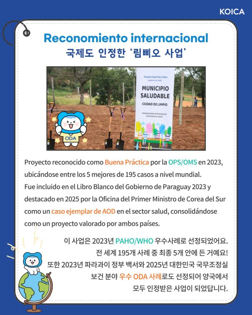 KOICA 관계자는 “림삐오 사업은 지역사회 기반의 통합 보건의료 서비스 모델을 제시하고, 주민들의 삶의 질 개선에 직접적으로 기여한 한국 ODA의 자랑스러운 성과”라며, “앞으로도 파라과이와 긴밀히 협력하여 더욱 건강한 공동체를 만들어나가는 데 기여할 것”이라고 밝혔다.